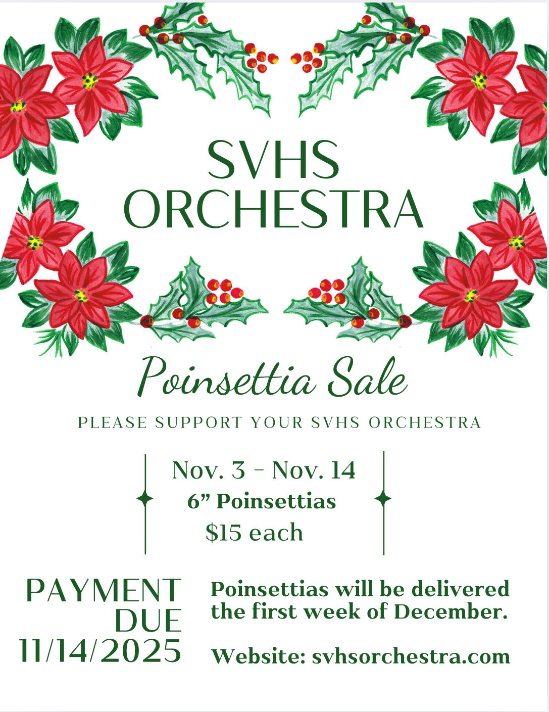 Mark you calendars, share this in your social groups, and with your friends and neighbors! Percentage of proceeds go to the SVHS orchestra.
